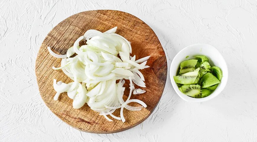 Для придания шашлыку особого вкуса и нежности стоит приготовить оригинальный маринад из киви. Начать следует с подготовки ингредиентов. Лук очищается и нарезается мелкими кусочками, а киви разрезается пополам — мякоть рекомендуется аккуратно извлечь чайной ложкой и нарезать на маленькие кусочки.